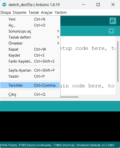 Şimdi sıra STM32 kartlarını Arduino IDE’nin Kart Yöneticisine eklememiz gerekiyor. Bunun için Arduino IDE’de önce Dosya>Tercihler: