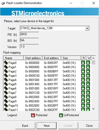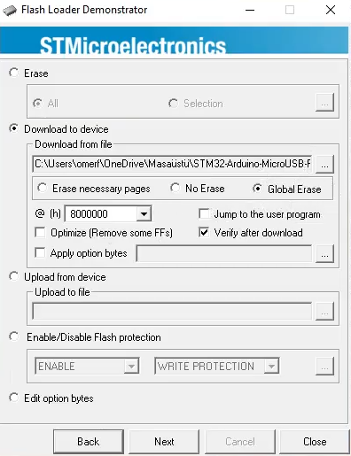 Şimdiki ekranda sizde varsayılan olarak Erase seçeneği seçili gelecektir, onu Download to Device olarak seçin. Ardından bootloader dosyasını seçin ve ayarları görseldeki gibi ayarlayın. Ardından Sonraki dediğinizde direk bootloader yazılmaya başlıyor. Bittiğinde tamam diyerek kapatın ve dönüştürücüyü bilgisayardan çıkarın sonra da STM32’nin bütün köprü ile olan bağlantılarını çıkarın. Kartın üzerindeki jumper konnektörlerini eski haline yani BOOT0’ı 0 a geri çekin.