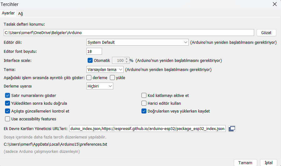 Sonra Tamam dedikten sonra Arduino IDE’yi yeniden başlatıyoruz. Sırasıyla: