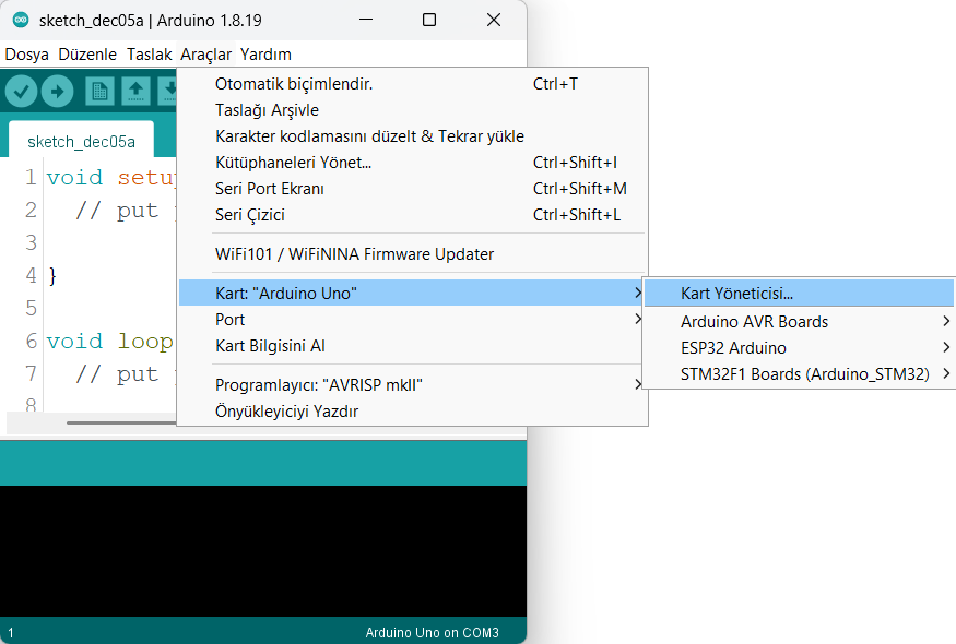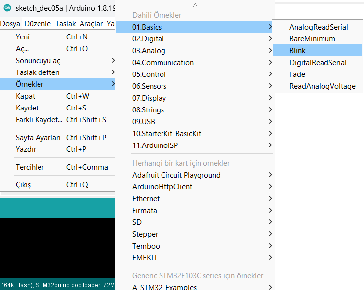 Sonra Arduino IDE’yi yeniden başlatıyoruz ve sırasıyla: