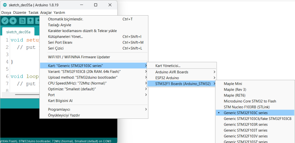 Araçlar>Kart>STM32F1 Boards>Generic STM32F103C Series veya sizinki neyse onu seçin: