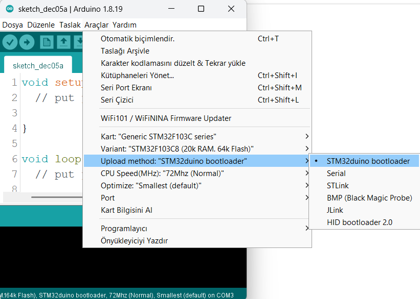 Araçlar>Upload Method>STM32DUINO BOOTLOADER olarak seçiyoruz ki MicroUSB protuyla programlayabilelim. İsterseniz Serial seçerek ve STM32’yi en baştaki gibi bootloader atarken yapılan bağlantıları yaparsanız bu şekilde de direk kullanabilirsiniz: